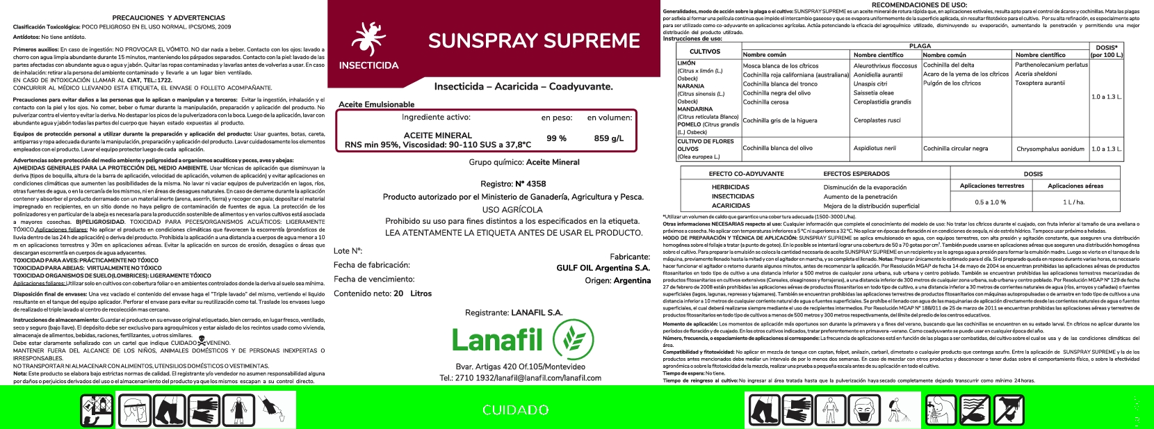 SUNSPRAY SUPREME es un aceite mineral de rotura rápida que, en aplicaciones estivales, resulta apto para el control de ácaros y cochinillas. Mata las plagas por asfixia al formar una película continua que impide el intercambio gaseoso y que se evapora uniformemente de la superficie aplicada, sin resultar fitotóxico para el cultivo. Por su alta refinación, es especialmente apto para ser utilizado como co-adyuvante en aplicaciones agrícolas. Actúa potenciando la eficacia del agroquímico utilizado, disminuyendo su evaporación, aumentando la penetración y permitiendo una mejor distribución del producto utilizado.