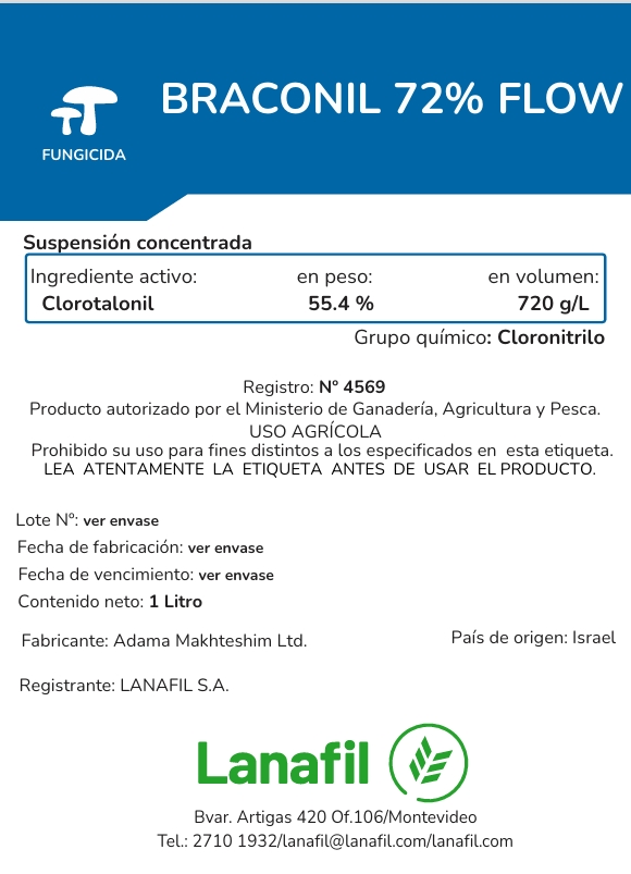 BRACONIL 72% FLOW es un fungicida de contacto de amplio espectro indicado para el control de enfermedades causadas por hongos en frutales y hortalizas de acuerdo a lo establecido en la etiqueta. Posee una muy buena estabilidad climática, y las partículas depositadas sobre la superficie foliar mantienen su actividad fungicida por un largo período, debido a la capacidad de re-distribuirse con la humedad.