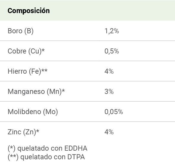 Producto de disolución rápida y completa. Desarrollado para aplicación foliar, también apto para fertirrigación en campo abierto e invernadero. Naturaleza física Sólido (Microgranulado) Solubilidad a 20°C 520 g/L pH Solución 0,1% 7,2 CE en solución 0,1% 0,31 mS/cm