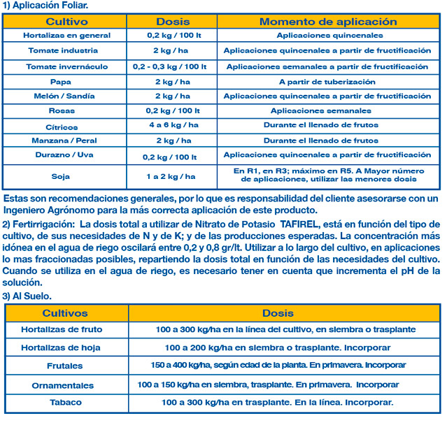 El Nitrato Potásico TAFIREL es un fertilizante mixto, NK, que puede ser utilizado tanto en aplicación foliar como en fertirrigación, así como para aplicación directa al suelo, ya que no sufre pérdidas por volatilización. Está compuesto por Nitrógeno Nítrico (13% p/p) y Óxido de Potasio (K2O Soluble en agua; 45% p/p) El Nitrógeno (N), es un nutriente esencial para el crecimiento de las plantas, es parte constitutiva de cada