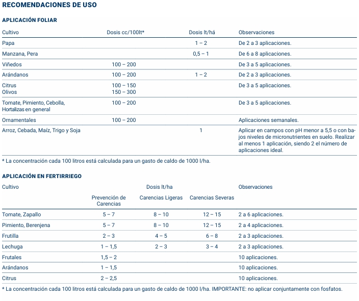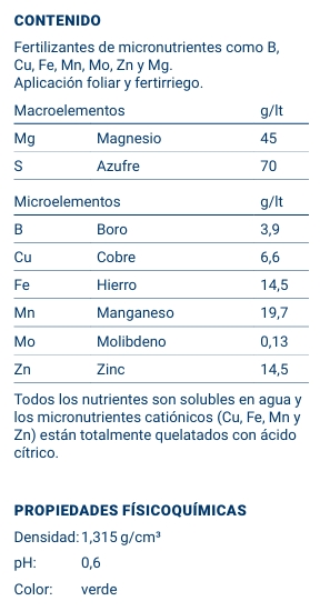 Fertilizante foliar líquido altamente concentrado en micronutrientes para la prevención y corrección de este tipo deficiencias, de Magnesio y Azufre.