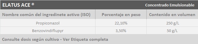 · ELATUS ACE es un fungicida sistémico para el control de enfermedades foliares en los cultivos de trigo y cebada. Combina la acción del principio activo Benzovindiflupyr con Propiconazol. Benzovindiflupyr es un fungicida de amplio espectro perteneciente al grupo químico de las carboxamida, inhibidor de la SDHI (FRAC), el cual inhibe el Complejo II de la respiración (SDHI). Propiconazol, es un triazol con efecto preventivo y curativo, inhibidor de biosíntesis de esteroles de membrana (DMI) (FRAC), inhibe en forma significativa el desarrollo subcuticular del micelio del hongo y previene el desarrollo de los síntomas de las enfermedades. ELATUS ACE es la combinación de ambos principios activos con diferentes sitios de acción, lo que resulta apropiado para la reducción del riesgo de aparición de cepas resistentes.