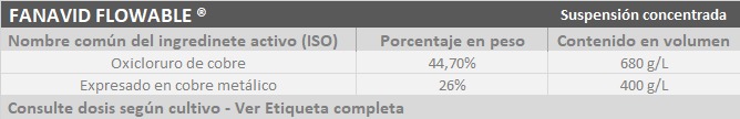 · FANAVID FLOWABLE es una formulación de Oxicloruro de Cobre. Las ventajas de los flowables son varias. No es necesario el empleo de balanza para la dosificación. En su manipuleo no se producen polvos indeseables, eliminándose así los riesgos de inhalación del operario. Mayor rapidez de preparación por su facilidad de dispersión. Tamaño de partícula menor, la mayor parte debajo de 2 micras. Esta característica mejora sustancialmente la cobertura, aumenta la adherencia, prolonga el tiempo de permanencia del producto en suspensión (aún sin agitación) y minimiza las posibilidades de obstrucción y el desgaste. Su coloración azul permite detectar fácilmente las plantas que ya fueron tratadas.