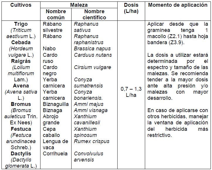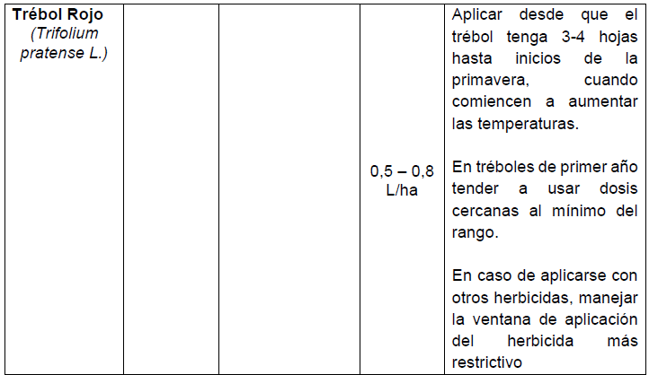 Recomendaciones específicas: Evitar las aplicaciones con alta temperatura. Aplicar preferentemente con malezas pequeñas y en activo crecimiento.