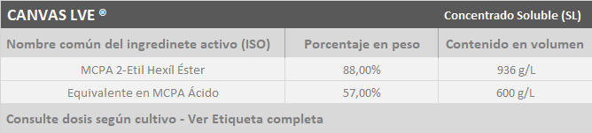 CanvasTM LVE es un herbicida post-emergente sistémico, de acción hormonal (regulador del crecimiento), que se absorbe por vía foliar de las malezas sensibles. Es indicado para el control de ciertas malezas de hoja ancha en cultivos de Trigo, Cebada, gramíneas tanto perennes como anuales puras o asociadas con Trébol Rojo y semilleros de Trébol Rojo puro.