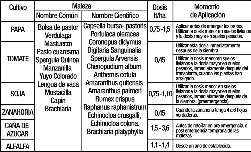 METRIBUZIN TAFIREL es un herbicida selectivo y residual que puede aplicarse en forma pre emergente o post emergente para el control de malezas anuales latifoliadas y algunas gramíneas. Puede ser utilizado en los cultivos de soja, papa, caña de azúcar, alfalfa, zanahoria y tomate.
