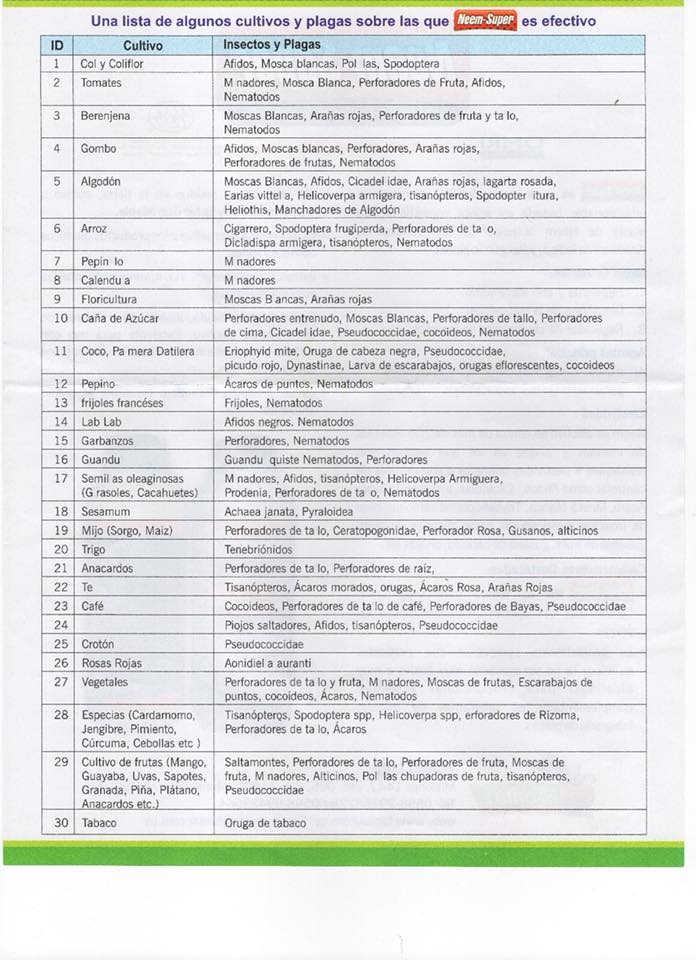 Super Neem es efectivo contra más de 200 insectos plaga, de los que algunos incluso son resistentes a insecticidas químicos, y difíciles de controlar como por ejemplo Afidos, Cicadulas, Insectos de la fruta, Ácaros, Orugas, Mosca Blanca, entre muchos otros.