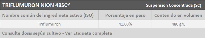 NION 48 S.C. es un insecticida de contacto e ingestión, de acción fisiológica que actúa inhibiendo la síntesis de quitina en los insectos.