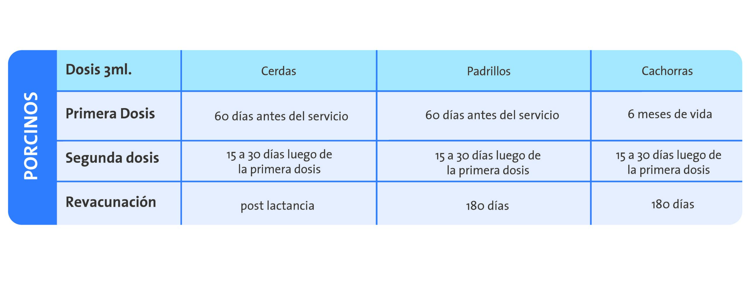 Porcinos: Reproductores: 2 dosis, 60 y 30 días previos al servicio. Las cerdas deberán revacunarse dentro de los 10 a 15 días posteriores a la lactancia. Los padrillos, deberán ser revacunados cada 180 días. El esquema de vacunación sugerido debe adaptarse a la recomendación de su veterinario, según las necesidades particulares de cada región o establecimiento.
