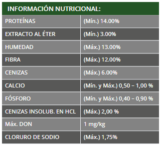 Maíz y/o Avena y/o Cebada y/o Afrechillo de Arros y/o Harina de Girasol y/o Harina de Soja y/o Harina de Leguminosas y/o Carbonato de Calcio y/o Fosfato Bicálcico y/o Cloruro de Sodio y/o Arechillo de Trigo y/o Oleina y/o Melaza y/o Vitaminas.