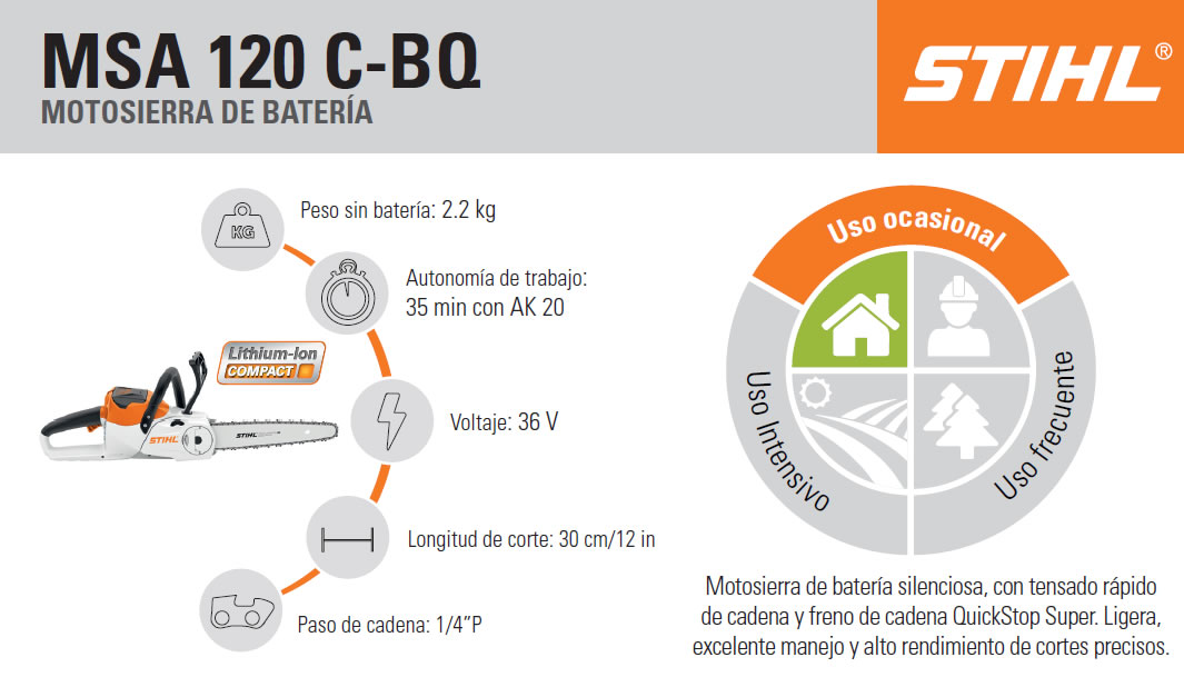 Motosierra a batería ligera para el cuidado del jardín y actividades artesanales. Empuñadura blanda, cambio de cadena rápido y cómodo mediante tensado rápido de cadena STIHL, freno de cadena QuickStop Super, depósito de aceite con ventanilla transparente, alto rendimiento de corte mediante cadena de PM3 de 1/4″.